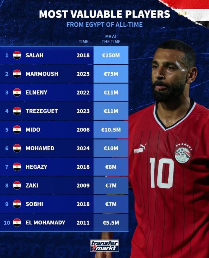 德转列埃及球员历史身价榜:萨拉赫1.5亿第1,马尔穆什第2